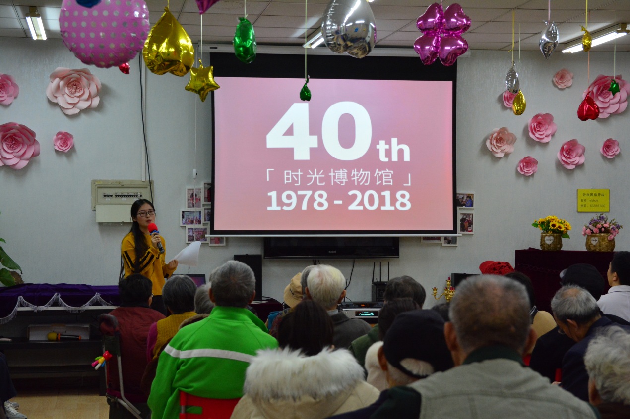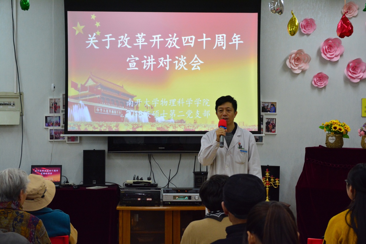 支部书记王艺驰说:“今年是改革开放四十周年,这是一个巧妙的时间将在坐的爷爷奶奶党员们跟我们年轻党员联系起来,四十年前爷爷奶奶们也就差不多我们这个年纪,站在时间轴两个端点的,四十年后的我们接过您们的接力棒,务实前行。”