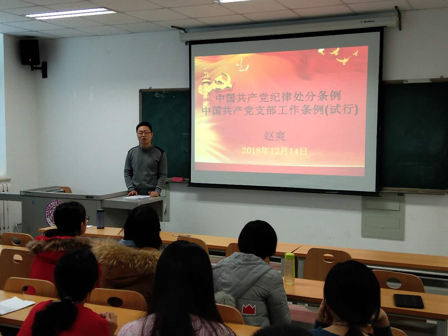 12月14日,物理科学学院学生党总支在三教105进行集中理论学习,专题学习《中国共产党纪律处分条例》和《中国共产党支部工作条例(试行)》。学生党总支书记赵爽主持并领学,学生党总支委员、学生党员参加本次学习。
