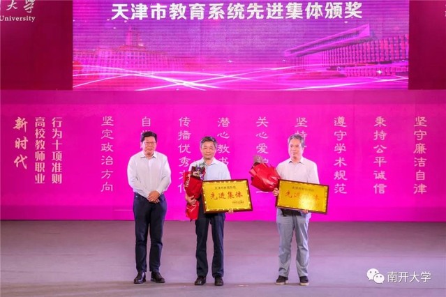 物理科学学院获评天津市教育系统先进集体称号。会上,许京军向天津市教育系统先进集体物理科学学院颁发奖牌。