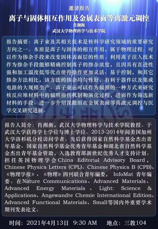 【学术报告】离子与固体相互作用及金属表面等离激元调控