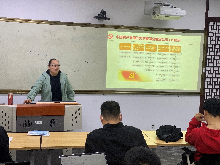 物理科学学院党委专职组织员夏焕云老师为学员们作了入党流程规范主题培训。她结合党章、相关细则和规定,详细介绍了从入党积极分子到成为正式党员的工作流程。她强调,各位学员务必重视入党流程规范,遵守党的章程,在理论学习和社会实践中淬火成钢,不断前进,积极向党组织靠拢,争取早日成为一名合格的中国共产党党员。