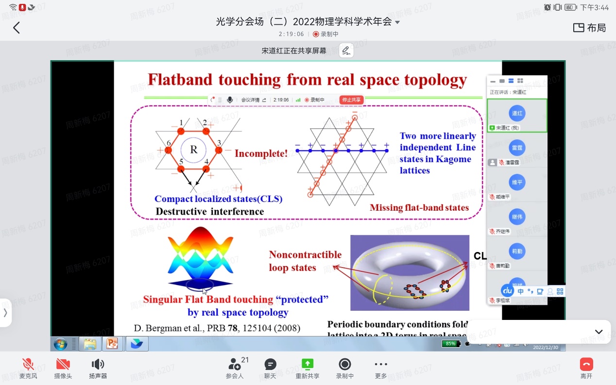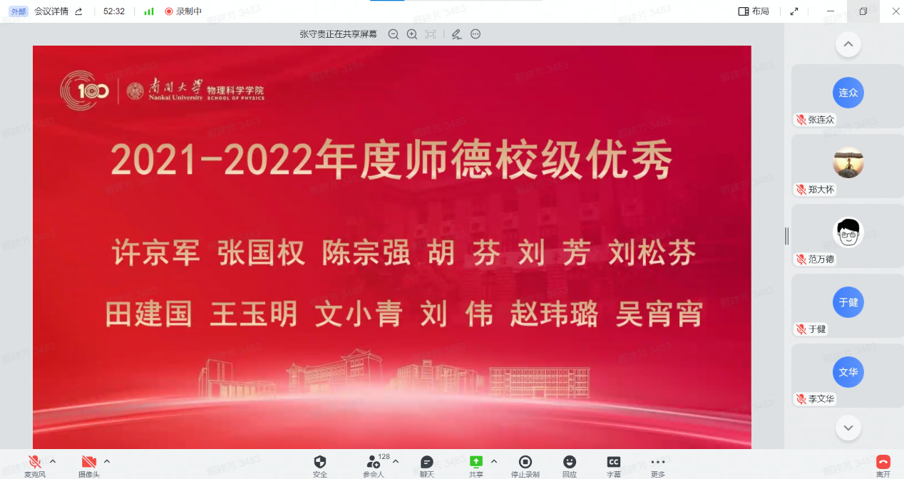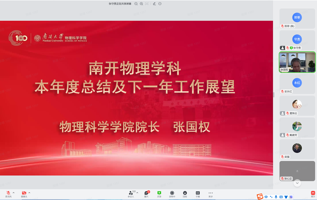 12月30日,物理科学学院全院教师大会暨2022年南开物理学术年会成功举办,全院教师齐聚云端,总结经验,表彰先进,谋划未来,凝聚共识,物理科学学院和泰达应用物理研究院全体教师和博士后130余人参加,学院党委书记史永红主持开幕式。
