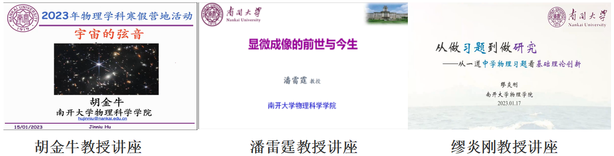 专题讲座由物理科学学院教授胡金牛、潘雷霆和缪炎刚讲授。胡金牛教授以《宇宙的弦音》为题,从声音是如何产生的,到电磁波,再到宇宙星体的声音,讲解由浅至深,内容生动有趣。潘雷霆教授以《微光学成像的前世与今生》为题,为同学们讲解了显微光学成像发展简史、显微镜结构与分类、显微光学成像原理等一系列问题。缪炎刚教授以《从习题到科研》为题,为同学们讲解如何从一道中学物理习题中看到基础理论创新。