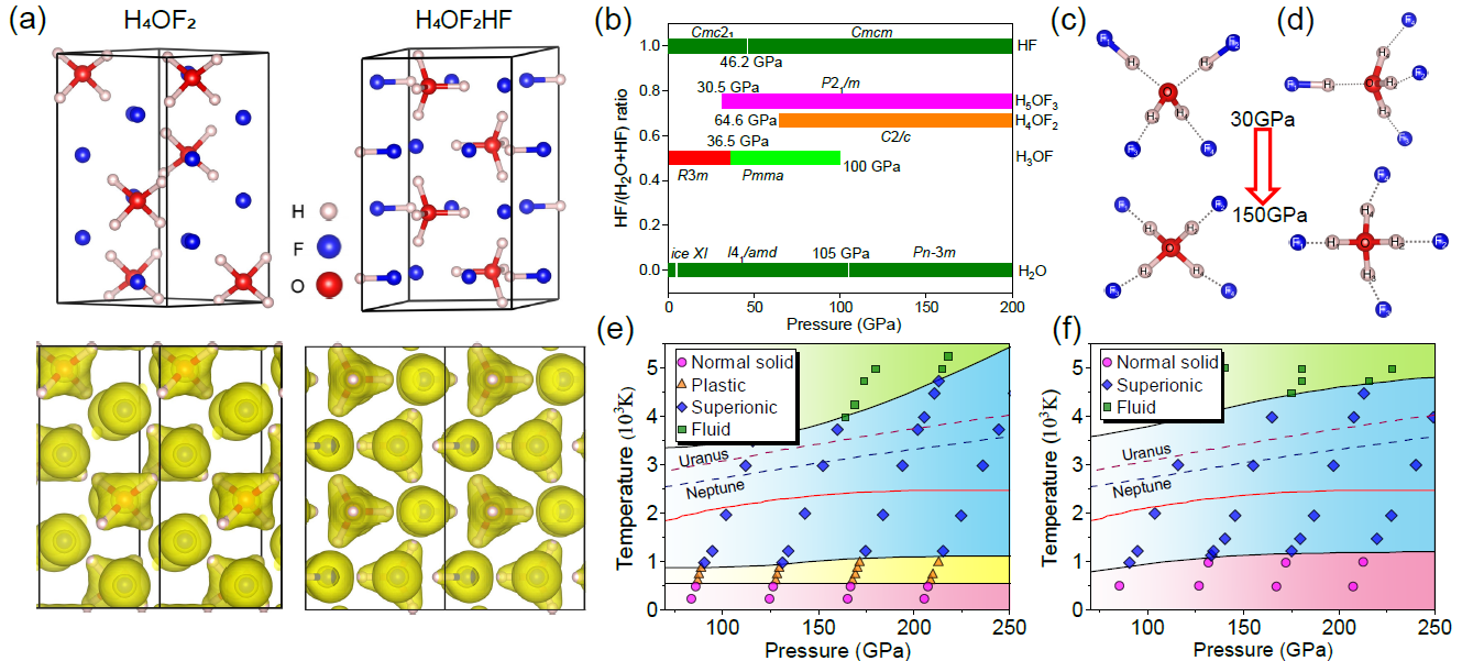 图(a)H4OF2, H4OF2HF的晶体结构和电子局域函数图;图(b)H2O-HF体系压力组分相图;图(c)(d)H4OF2和H4OF2HF结构压力下质子转移示意图;图(e)(f)H4OF2, H4OF2HF温度压力相图。