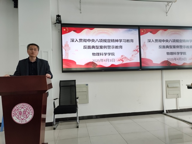 4月3日,物理科学学院召开师德师风建设专题推进会。会议围绕深入学习贯彻全国教育大会精神,贯彻落实习近平总书记来校视察重要讲话精神,结合深入贯彻中央八项规定精神学习教育和巡视整改任务落实,统筹推进学院“三全育人”综合改革试点院系建设引领,开展违反中央八项规定精神反面典型案例教育,部署科研经费自查自纠工作。学院党委书记唐柏权主持会议并讲话,特邀党委教师工作部副部长李红钢做师德师风讲座。学院全体教职工参加会议。