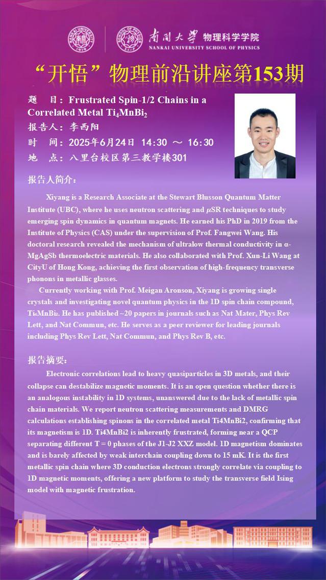 【“开悟”物理前沿讲座 (第153期)】Frustrated Spin-1/2 Chains in a Correlated Metal Ti4MnBi2