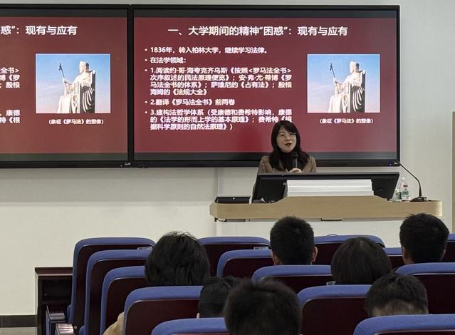 首先,齐艳红梳理青年马克思的成长轨迹。她介绍到,马克思在大学期间曾因信念缺位陷入迷茫转学柏林大学后,理想信念支撑他直面哲学创作的困惑过程中曾经因接触黑格尔哲学短暂振奋过,也因理论无法解决现实问题陷入苦恼过,是初心推动他持续求索。她以生动的故事告诉同学们理想信念是青春的定盘星”。