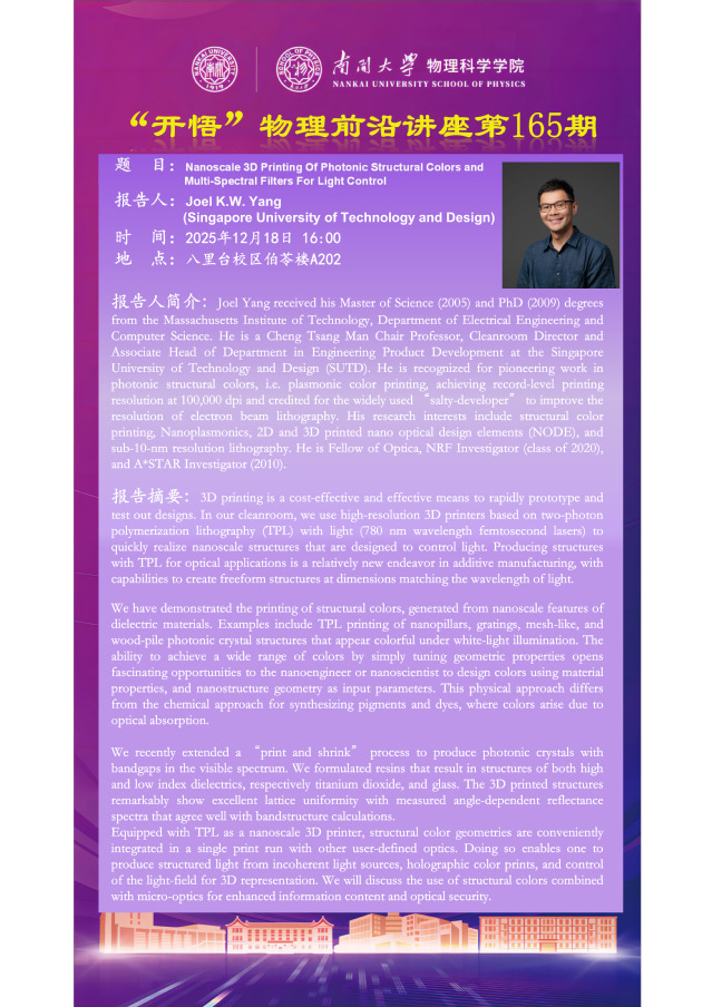 【“开悟” 物理前沿讲座 (第165期)】Nanoscale 3D Printing of Photonic Structural Colors and Multi-Spectral Filters for Light Control
