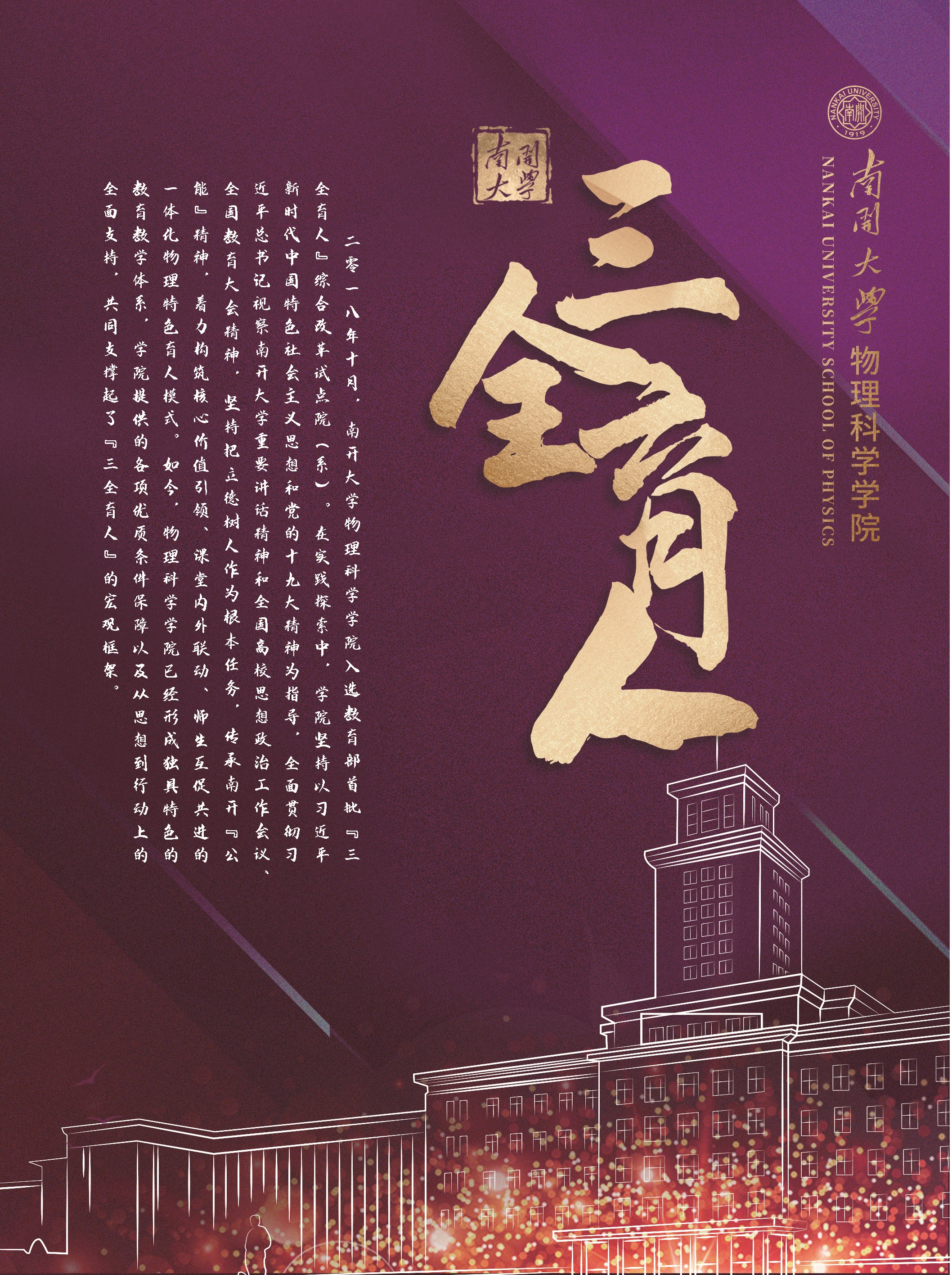 2018年10月,Betway体育西汉姆联物理科学学院入选教育部首批“三全育人”综合改革试点院(系)。在实践探索中,学院坚持以习近平新时代中国特色社会主义思想和党的十九大精神为指导,全面贯彻习近平总书记视察Betway体育西汉姆联重要讲话精神和全国高校思想政治工作会议、全国教育大会精神,坚持把立德树人作为根本任务,传承南开“公能”精神,着力构筑核心价值引领、课堂内外联动、师生互促共进的一体化物理特色育人模式。如今,物理科学学院已经形成独具特色的教育教学体系,学院提供的各项优质条件保障以及从思想到行动上的全面支持,共同支撑起了“三全育人”的宏观框架。