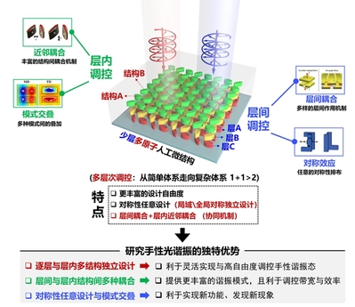 人工微结构的产生和发展为手性产生机理的深入研究和手性的精准构筑提供了一种有效方式。不同于自然界中传统的材料,人工微结构的光学响应主要取决于其本身的几何结构而非其构成成分,因而其能够具有自然界中现有材料所不具有的全新光学性质,产生自然界中不存在的全新光学现象。在人工微结构的设计过程中,通过对微结构单元的结构参数和空间分布进行人为设计,就能够让所设计的人工微结构缺乏镜面对称性,从而表现出手性。因此,利用人工微结构实现手性构筑,进而研究手性产生和增强的物理机制成为微纳光学研究领域的研究热点。相关研究不仅仅局限于三维手性的构筑和增强,人工微结构中平面手性和外在手性的精准构筑由于在自旋光场调控领域具有广泛的应用前景也受到了相关研究者的广泛关注。研究组围绕手性人工微结构精准构筑及其应用开展了系统研究,揭示了手性人工微结构中手性光学响应产生的物理机制,提出了手性人工微结构中手性光学响应产生和调控新方案,基于手性人工微结构对光场多个维度的自旋选择调控实现了手性灰度成像、手性光学防伪和圆偏振光场探测等应用。特别地,研究组进一步揭示了微结构谐振及其耦合在调控人工微结构手性光学响应方面的重要作用,为手性人工微结构的设计和应用提供了新的方式。取得的代表性成果包括: 1.提出了人工微结构中结构对称破缺诱导手性光谐振产生新机制,厘清了结构变量与手性光谐振的内在关系,实现了对光场的自旋选择多维度操控。实现对圆偏振光场多个维度的联合调控是人工微结构领域近期研究热点。研究组发现在人工微结构中可以通过对称性破缺诱导出高阶手性非辐射谐振模式,从而实现对特定圆偏振反射的高效控制而对相反旋性圆偏振光没有作用,厘清了高阶手性非辐射谐振模式的谐振强度、谐振波长和远场辐射相位与微结构结构参数的关系,证明了仅通过三个结构参数的近独立调控就可以实现对特定圆偏振反射强度和相位在任一波长下的连续控制,为光场的自旋选择多维度调控提供了新方案。[Adv. Mater. 32, 1907983 (2020)] 2.揭示了人工微结构不同结构间谐振耦合在构筑和调控手性光谐振方面的关键作用,实现了高阶手性灰度成像、高效圆偏振光非对称透射和极手性光学响应。人工微结构中手性光谐振研究的多数工作聚焦于研究微结构本征谐振模式的产生机制和调控规律,而没有过多关注不同结构间谐振耦合在构筑和调控手性光谐振方面的重要作用。研究组与中科院物理所李俊杰研究员合作,利用离子束诱导结构弯曲技术将平面人工微结构的部分结构进行空间卷曲,为人工微结构结构手性的产生提供了新方案。研究组在卷曲微结构中发现了卷曲结构和未卷曲结构之间的谐振耦合机制,实现了对光场的单向反射。Laser Photonics Rev. 14, 1900179 (2020) 3.发现了人工微结构非局域表面等离激元干涉耦合产生手性光谐振新原理,实现了手性奇异点在动量空间的高效调控及手性光学防伪,发展了圆二向色性和品质因子可独立调控手性光谐振构筑新方法。手性人工微结构前期工作多关注局域手性光谐振产生与调控,近期研究表明人工微结构中的表面晶格共振、导模共振和准连续体中的束缚态等非局域谐振模式在光场调控方面具有重要应用价值。研究组近期工作发现,在金属人工微结构中通过调控非局域表面等离激元的干涉耦合能够构筑非局域手性光谐振模式,为人工微结构中非局域手性谐振的产生与调控提供了新原理和新方案。研究组基于非局域表面等离激元干涉耦合提出了在动量空间构筑和调控手性奇异点新方案,仅通过改变两个结构参量就能够在保证工作波长不变的基础上在动量空间大范围内产生手性奇异点,并利用该方案在实验室实现了自旋和波长选择的手性灰度信息编码,为动量空间手性奇异点的产生与调控提供了新方案。Laser Photonics Rev. 18, 2301257 (2024) 研究方向2:少层多原子人工微结构光场调控及应用