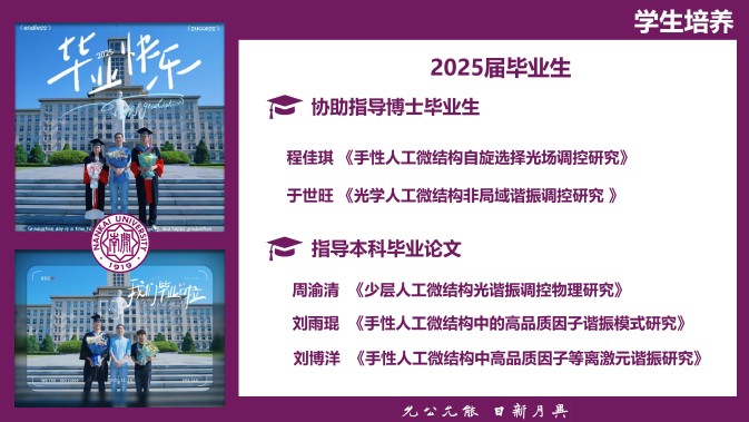 研究方向招生计划:每年计划招收硕士研究生1-2人 研究方向1:手性人工微结构及其光场调控应用 手性反映了物质分子的空间结构不存在镜面对称。手性存在于自然界许多分子中,例如糖类、氨基酸和蛋白质。手性在生命科学、医药学和合成化学等领域都占有重要地位,许多复杂的生物和化学反应过程都有具有特定手性的物质参与其中。因此,研究手性的起源,实现手性的精准构筑对于现代生命科学、医药学、合成化学和自旋光子学等领域的发展具有重要意义,相关研究近年来受到了生物和化学等领域研究人员的广泛关注。然而自然界中的手性物质与光场的相互作用非常有限,产生的光学效应非常微弱,这使得物质手性的探测和分辨非常困难。在显著提高手性光学响应的前提下提出一种实现手性精准构筑的方法,对于手性起源的研究以及拓展手性在生物、化学、物理、材料等领域的应用都具有非常重要意义。