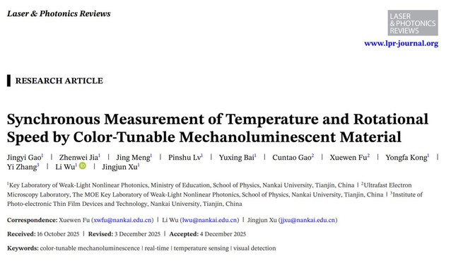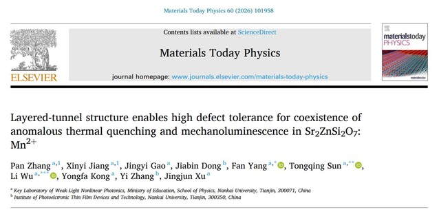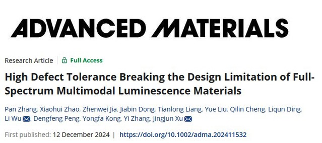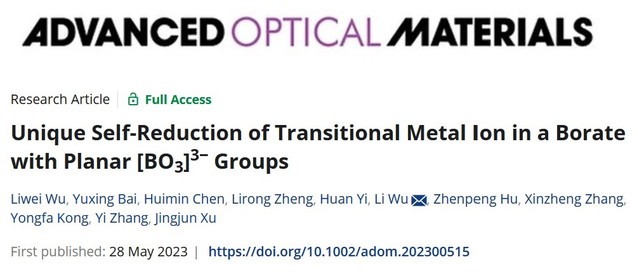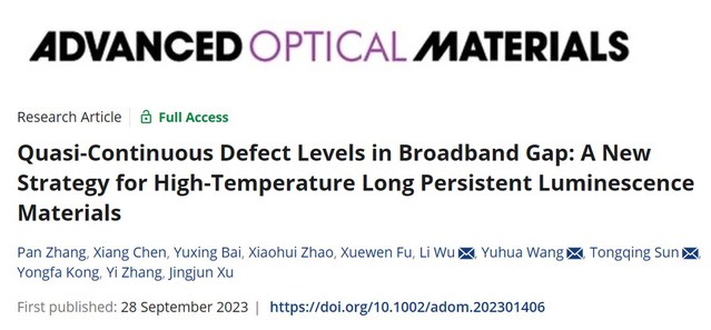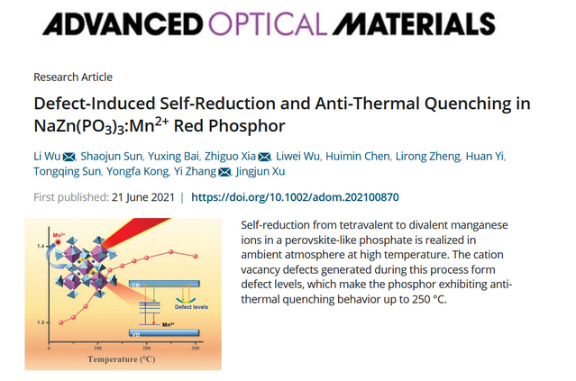J. Y. Gao, Z. W. Jia, J. Meng, P. S. Lv, Y. X. Bai, C. T. Gao, X. W. Fu*, L. Wu*, Y. F. Kong, Y. Zhang, and J. J. Xu*. Synchronous measurement of temperature and rotational speed by color-tunable mechanoluminescent material, Laser & Photonics Reviews, 2025; 0:e02783. Pan Zhang, Xinyi Jiang, Jingyi Gao, Jiabin Dong, Fan Yang*, Tongqing Sun*, Li Wu*, Yongfa Kong, Yi Zhang, and Jingjun Xu, Layered-Tunnel Structure Enables High Defect Tolerance for Coexistence of Anomalous Thermal Quenching and Mechanoluminescence in Sr2ZnSi2O7:Mn2+, Materials Today Physics, 2026, 60, 101958. Pan Zhang, Xiaohui Zhao, Zhenwei Jia, Jiabin Dong, Tianlong Liang, Yue Liu, Qilin Cheng, Liqun Ding, Li Wu*, Dengfeng Peng, Yongfa Kong, Yi Zhang, Jingjun Xu*, High Defect Tolerance Breaking the Design Limitation of Full-Spectrum Multimodal Luminescence Materials, Advanced Materials, 2025, 37(5), 2411532. Zhenwei Jia, Xiaohui Zhao, Jingyi Gao, Tongqing Sun*, Li Wu,* Yongfa Kong, Jingjun Xu, A novel broadband near-infrared phosphor Na3Mg4LiSi12O30:Cr3+: moderate synthesis and application, Journal of Materials Chemistry C, 2025, 13, 385 – 392. Pan Zhang, Xiang Chen, Yuxing Bai, Xiaohui Zhao Xuewen Fu, Li Wu,* Yuhua Wang,* Tongqing Sun,* Yongfa Kong, Yi Zhang, and Jingjun Xu, Quasi-Continuous Defect Levels in Broadband Gap: A New Strategy for High-Temperature Long Persistent Luminescence Materials, Advanced Optical Materials 12 (2024) 2301406. Liwei Wu, Yuxing Bai, Huimin Chen, Lirong Zheng, Huan Yi, Li Wu,* Zhenpeng Hu, Xinzheng Zhang, Yongfa Kong, Yi Zhang, and Jingjun Xu, Unique Self-Reduction of Transitional Metal Ion in a Borate with Planar [BO3]3− Groups, Advanced Optical Materials 11(19) (2023) 2300515. Yuxing Bai, Liwei Wu, Qilin Cheng, Li Wu*, Yongfa Kong, Yi Zhang, and Jingjun Xu, Li+ Doping Induced Zero-Thermal Quenching in Cs3Zn6–x–yB9O21:xEu3+, yLi+ (0 ≤ x ≤ 0.10, 0.06 ≤ y ≤ 0.16), Journal of Rare Earths, 41 (10) (2023) 1478-1486. (Cover) Li Wu*, Shaojun Sun, Yuxing Bai, Zhiguo Xia*, Liwei Wu, Huimin Chen, Lirong Zheng, Huan Yi, Tongqing Sun, Yongfa Kong, Yi zhang*, and Jingjun Xu, Defect-induced Self-reduction and Anti-thermal Quenching in NaZn(PO3)3:Mn2+ Red Phosphor, Advanced Optical Materials 9 (2021) 2100870. Doudou Qian, Lei Liu, Zhixue Xing, Rui Dong, Li Wu*, Hongkun Cai*, Yongfa Kong, Yi Zhang, Jingjun Xu, Improvement of photoluminescence of perovskite CH3NH3PbI3 by adding additional CH3NH3I during grinding, Chinese Physics Letters, 38 (8) 2021, 087801. Yuxing Bai, Zhongzhong Zheng, Li Wu*, Yongfa Kong, Yi Zhang*, Jingjun Xu, Construction of a novel mechanoluminescent phosphor Li2MgGeO4:Mn2+ by defect control, Dalton Transactions 50 (2021) 8803-8810. Zhongzhong Zheng, Yuxing Bai, Yijie Ren, Huimin Chen, Li Wu*, Yongfa Kong, Yi Zhang*, Jingjun Xu, Intrinsic and extrinsic defects build a novel mechanoluminescent phosphor Na2MgGeO4:Mn2+, Journal of Materials Chemistry C 9 (2021) 3513-3521. Huimin Chen, Yuxing Bai, Lirong Zheng, Li Wu*, Liwei Wu, Yongfa Kong, Yi Zhang*, Jingjun Xu, Interstitial oxygen defect induced mechanoluminescence in KCa(PO3)3:Mn2+, Journal of Materials Chemistry C 8 (2020) 6587-6594. Huimin Chen, Li Wu*, Tongqing Sun, Rui Dong, Zhongzhong Zheng, Yongfa Kong, Yi Zhang*, Jingjun Xu, “Intense green elastico-mechanoluminescence from KZn(PO3)3:Tb3+”, Applied Physics Letters 116 (5) (2020). Huimin Chen, Liwei Wu, Fang Bo, Jikang Jian, Li Wu*, Hongwei Zhang*, Lirong Zheng*, Yongfa Kong, Yi Zhang, Jingjun Xu, Coexistence of self-reduction from Mn4+ to Mn2+ and elastico-mechanoluminescence in diphase KZn(PO3)3:Mn2+, Journal of Materials Chemistry C 7 (2019) 7096-7103. Liwei Wu, Yuxing Bai, Li Wu*, Huan Yi, Xinzheng Zhang, Lixin Zhang, Yongfa Kong, Yi Zhang*, Jingjun Xu, Analysis of the structure and abnormal photoluminescence of a red-emitting LiMgBO3:Mn2+ phosphor, Dalton Transactions, 47 (2018) 13094-13105.