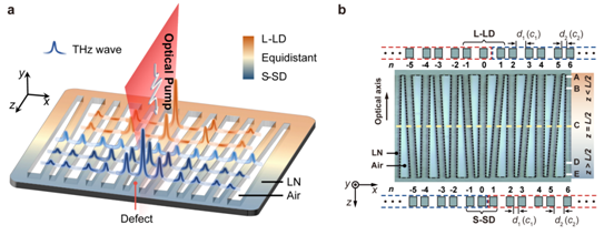 Compact terahertz (THz) functional devices are greatly sought after for high-speed wireless communication, biochemical sensing, and non-destructive inspection. However, controlled THz generation, along with transport and detection, has remained a challenge especially for chip-scale devices due to low-coupling efficiency and unavoidable absorption losses. To address this challenge, a new paper published in Light Science & Application, by a team of scientists, led by Professor Jingjun Xu and Zhigang Chen from the MOE Key Laboratory of Weak-Light Nonlinear Photonics, TEDA Institute of Applied Physics and School of Physics, Nankai University, Tianjin 300457, China, and co-workers havedemonstrated nonlinear generation and topologically tuned confinement of THz waves in an engineered lithium niobate chip forming a wedge-shaped Su-Schrieffer-Heeger lattice. Such topological control of THz waves may bring about new possibilities in the realization of THz integrated circuits, promising for advanced photonic applications.