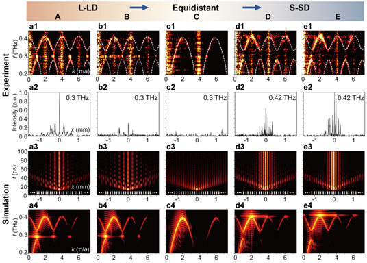 (a1-e1) Measured spectra at the corresponding positions. (a2-e2) Energy distribution of the modes showing different confinement of the generated THz waves in the LN chip. (a3-e3) Simulated x-t diagrams showing the THz waves evolution in different regions, where (a4-e4) are the corresponding spectra. The lattice sites are illustrated by white tick marks in (a3-e3), and a in (a1, a4) is the lattice constant for the corresponding L-LD structure.